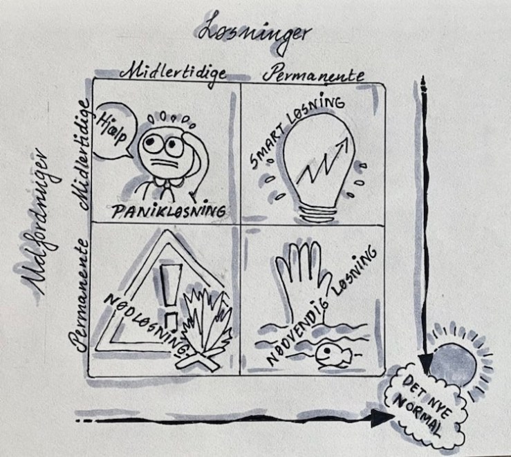Det interessante er, fortæller Lektor Suna Løwe Nielsen, at nogle virksomheder forventede en kortvarig krise med midlertidige udfordringer. Andre antog, at krisens udfordringer var et mere permanent bekendtskab. Ligeså opfattede nogle virksomheder deres innovative løsninger – deres svar på udfordringerne – som henholdsvis midlertidige eller permanente. Det giver forskellige typer af kriseinnovation: Panikløsning, smartløsning, nødløsning eller nødvendig løsning.